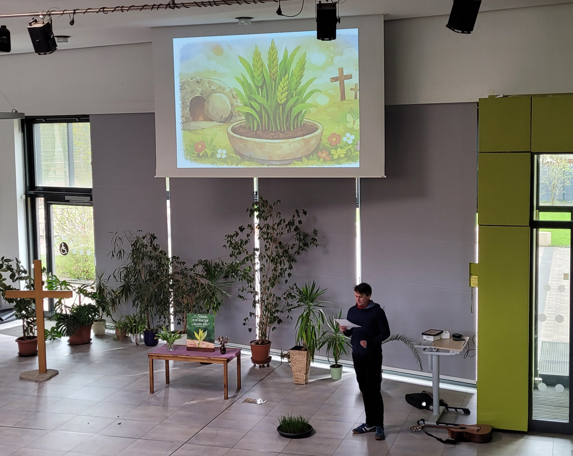 Am Tag nach den Osterferien feierten alle Grundschulkinder gemeinsam eine kleine Osterandacht. Es wurden die gesäten Weizenkörner bestaunt, die sich in den Osterferien zu kräftigen, grünen Halmen verwandelt haben. So stimmten alle fröhlich ins Halleluja ein und feierten das Fest der Auferstehung.